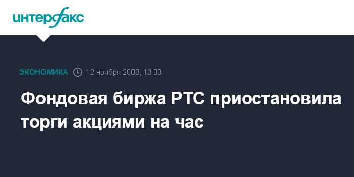 Москва. 12 ноября. INTERFAX.RU - Фондовая биржа РТС приостановила торги акциями с 13:05 мск на час в связи с понижением технического индекса более чем на 5% по сравнению со значением индекса на закрытие 11 ноября.