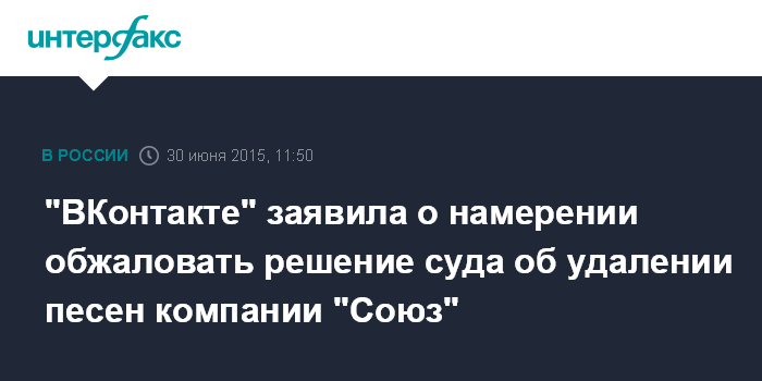 Москва. 30 июня. INTERFAX.RU - "ВКонтакте" обжалует решение Арбитражного суда Петербурга и Ленинградской области, обязывающее удалять музыкальные записи, принадлежащие звукозаписывающей компании "Союз", сообщил пресс-секретарь соцсети Георгий Лобушкин "Интерфаксу" во вторник.