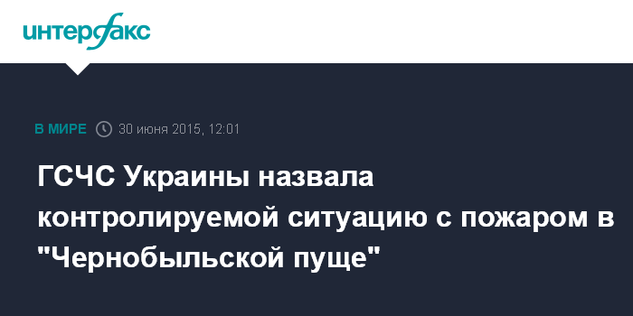 Москва. 30 июня. INTERFAX.RU - Глава Государственной службы Украины по чрезвычайным ситуациям Николай Чечёткин заявляет, что ситуация с возгоранием травы и камыша на территории "Чернобыльской пущи" в зоне отчуждения и безусловного отселения находится под контролем.