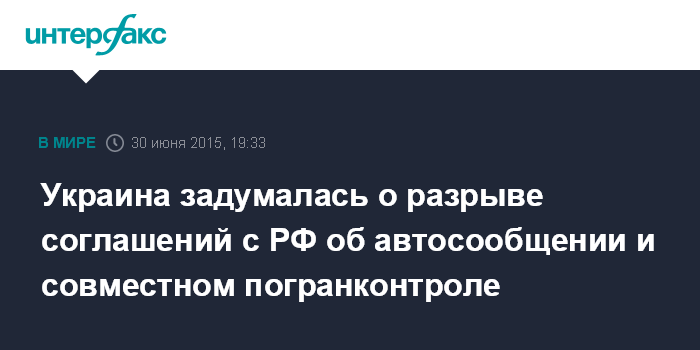 Москва. 30 июня. INTERFAX.RU - Законопроекты о денонсации соглашений между правительствами Украины и РФ "О международном автомобильном сообщении" (вместе с протоколом к нему) и "О сотрудничестве во время осуществления совместного контроля лиц, транспортных средств и товаров на украинско-российской государственной границе" внесены в Верховную Раду.