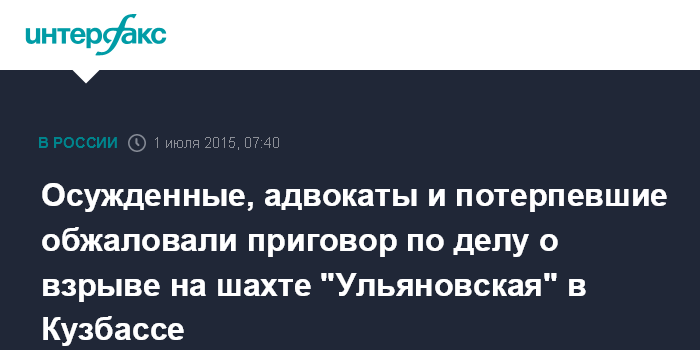 Москва. 1 июля. INTERFAX.RU - Осужденные по взрыву на шахте "Ульяновская" (Кемеровская область), в результате которого в 2007 году погибли 110 человек, не признали свою вину и написали апелляционные жалобы, сообщила агентству "Интерфакс" в пресс-службе прокуратуры региона.