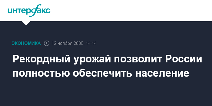 Москва. 12 ноября. INTERFAX.RU - Собранный в этом году в России рекордный урожай позволяет полностью обеспечить потребности населения и повысить экспортный потенциал страны, заявил президент России Дмитрий Медведев.