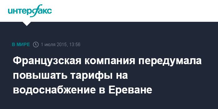 Москва. 1 июля. INTERFAX.RU - ЗАО "Ереван джур" ("Ереван вода") отозвало заявку в Комиссию по регулированию общественных услуг (КРОУ) на пересмотр тарифов на водоснабжение и отвод сточных вод.