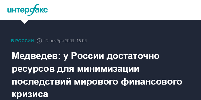 Москва. 12 ноября. INTERFAX.RU - Россия обладает достаточными ресурсами, чтобы минимизировать последствия глобального финансового и продовольственного кризиса, считает президент РФ Дмитрий Медведев.