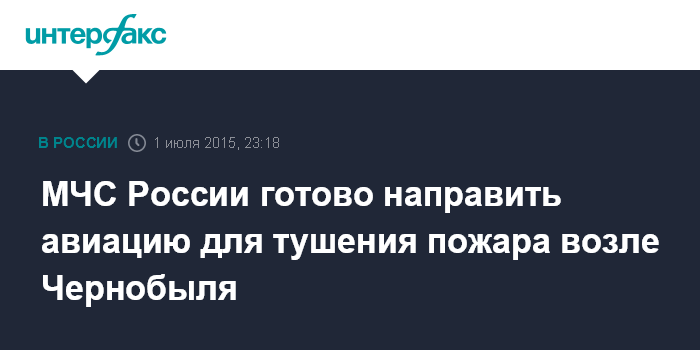 Москва. 1 июля. INTERFAX.RU - МЧС России готово направить специальную противопожарную авиацию для тушения пожара в Чернобыльской пуще (Украина) в зоне отчуждения, сообщили в пресс-службе МЧС РФ.