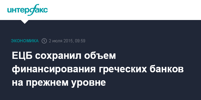 Москва. 2 июля. INTERFAX.RU - Европейский центральный банк (ЕЦБ) продолжит финансировать греческие банки в прежнем объеме до проведения референдума в стране.