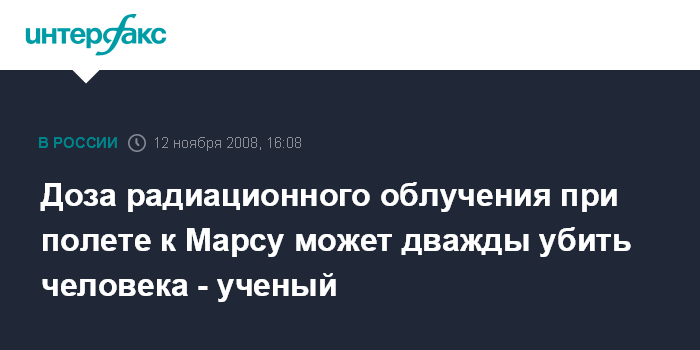 "Если бы в какой-либо из пилотируемых миссий "Аполлона" случилась вспышка на Солнце, ее участники могли получить большую дозу облучения и даже погибнуть. Однако полет к Луне и обратно длится порядка 10 дней. До Марса космонавтам придется добираться уже многие месяцы. Столь продолжительный полет без специальной радиационной защиты будет самоубийством. За два года полета суммарная доза радиации может в два раза превысить максимально допустимую норму", - сказал "Интерфаксу-АВН" в среду действительный академический советник Академии инженерных наук РФ Юрий Зайцев.