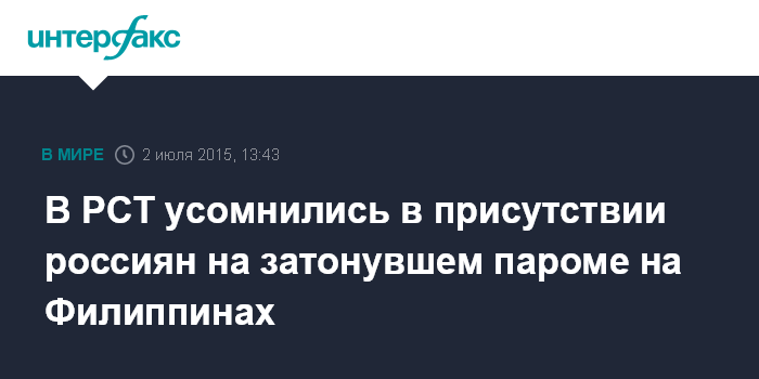 Москва. 2 июля. INTERFAX.RU - Россияне вряд ли были на затонувшем на Филиппинах пароме, сообщила порталу "Интерфакс" пресс-секретарь Российского союза туриндустрии (РСТ) Ирина Тюрина в четверг.