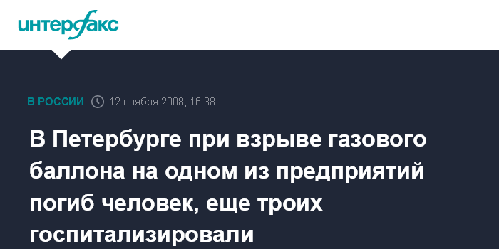 Москва. 12 ноября. INTERFAX.RU - В Петербурге на территории предприятия "Hевская мануфактура" взорвался газовый баллон, погиб один человек, сообщили "Интерфаксу" в Главном управлении МЧС по городу.