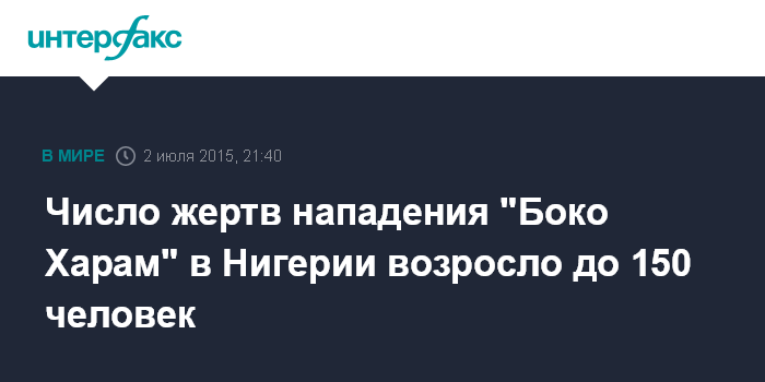 Москва. 2 июля. INTERFAX.RU – Почти 150 человек погибли в результате нескольких нападений боевиков из исламистской группировки "Боко Харам" в нигерийском штате Борно на северо-востоке страны, сообщают в четверг западные СМИ.