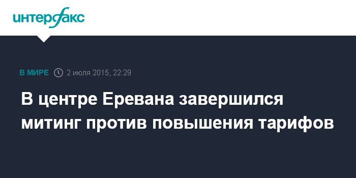 Москва. 2 июля. INTERFAX.RU - Митинг в центре Еревана против подорожания энерготарифов завершился, люди стали расходиться, сообщил корреспондент "Интерфакса".