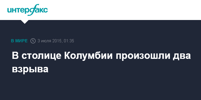 Москва. 3 июля. INTERFAX.RU - В Боготе, столице Колумбии, произошли два взрыва, из-за которых пострадали пять человек, сообщило в пятницу агентство Associated Press.