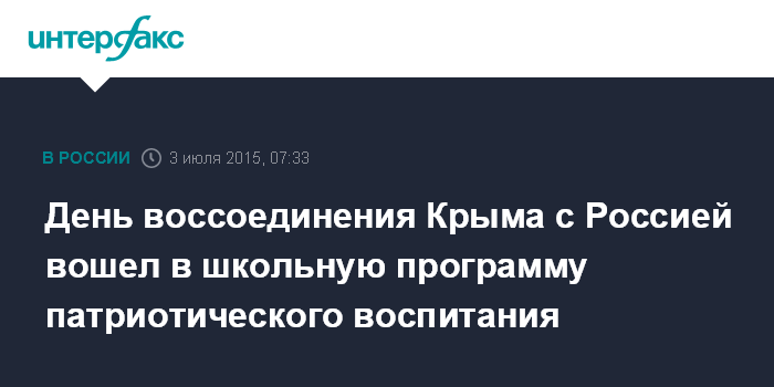 Москва. 3 июля. INTERFAX.RU - Четыре государственных праздника РФ, в том числе День воссоединения Крыма с Россией, включены в программу школьного патриотического воспитания, сообщил министр образования и науки РФ Дмитрий Ливанов.