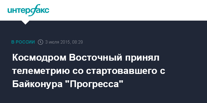 Москва. 3 июля. INTERFAX.RU - Командно-измерительный пункт космодрома Восточный (КСИСО) в пятницу впервые принял телеметрию со стартовавшего с космодрома Байконур транспортного грузового корабля "Прогресс М-28М".