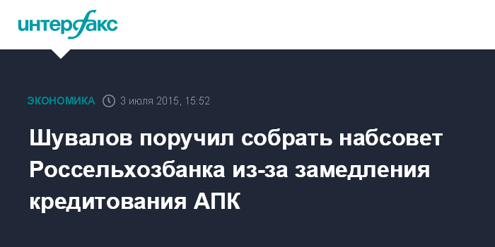 Москва. 3 июля. INTERFAX.RU – Первый вице-премьер Игорь Шувалов поручил провести внеплановое заседание набсовета Россельхозбанка по вопросу замедления темпов кредитования сельскохозяйственных товаропроизводителей в 2015 году, рассказал "Интерфаксу" источник в финансово-экономическом блоке правительства.