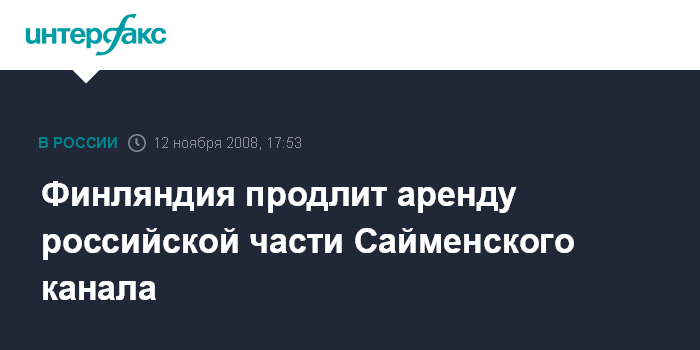 Москва. 12 ноября. INTERFAX.RU - Россия и Финляндия достигли договоренности о продлении финляндской стороной аренды российской части Сайменского канала, сообщил премьер РФ Владимир Путин.