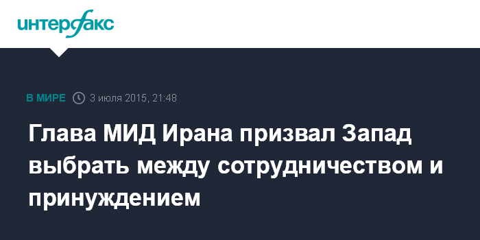 Москва. 3 июля. INTERFAX.RU - Глава МИД Ирана Джавад Зариф призвал западных партнеров по переговорам в Вене сделать выбор между сотрудничеством и принуждением.