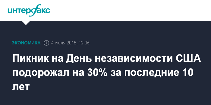 Москва. 4 июля. INTERFAX.RU - Расходы американцев на традиционные пикники-барбекю в честь Дня независимости США, отмечаемого 4 июля, выросли почти на треть за последние десять лет.
