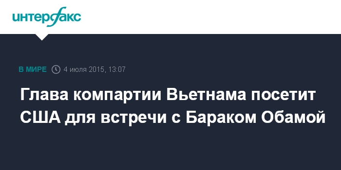 Москва. 4 июля. INTERFAX.RU - Руководитель Коммунистической партии Вьетнама отправится в США впервые на следующей неделе, заявив, что ожидает ответного визита президента США Барака Обамы в Ханой в этом году, пишет Guardian.