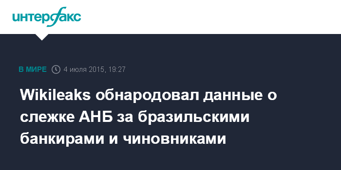 Москва. 4 июля. INTERFAX.RU - На сайте Wikileaks появилась новая публикация о том, что американское Агентство национальной безопасности (АНБ) шпионило за членами правительства Бразилии, сообщает "Би-Би-Си".