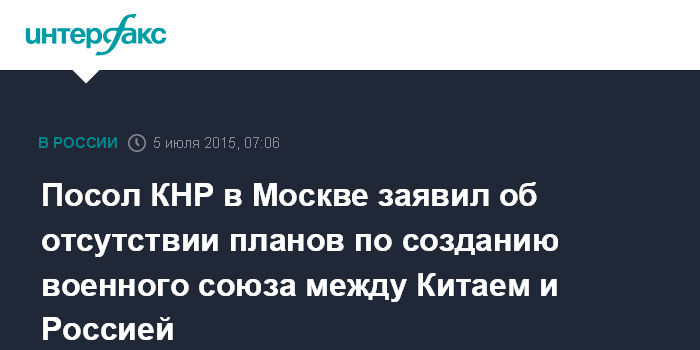 "Китай и Россия неоднократно указывали, что они не собираются создавать военный союз в какой-либо форме, а военное сотрудничество двух стран осуществляется в соответствии с базовыми нормами международного права, не направлено против третьей стороны и не затрагивает интересы третьих стран", - сказал дипломат в интервью агентству накануне саммитов Шанхайской организации сотрудничества (ШОС) и БРИКС (Бразилия, Россия, Индия, Китай, ЮАР), которые пройдут 8 - 10 июля в Уфе.