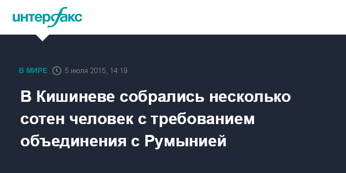 Москва. 5 июля. INTERFAX.RU - Сторонники объединения Молдавии с Румынией проводят в центре Кишинева митинг с призывом к властям двух стран начать объединительный процесс.