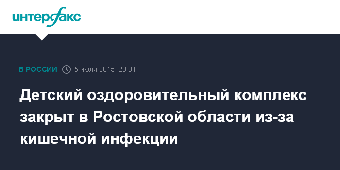 Москва. 5 июля. INTERFAX.RU - В Ростовской области закрыли детский оздоровительный комплекс "Спутник" из-за вспышки у детей острой кишечной инфекции, сообщает в воскресенье региональное Министерство здравоохранения.