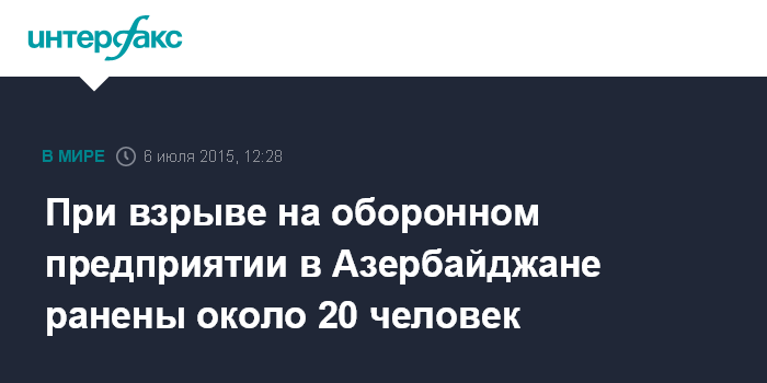Москва. 6 июля. INTERFAX.RU - В городе Ширван в центральном регионе Азербайджана произошел взрыв на заводе телемеханики, принадлежащем Министерству оборонной промышленности (МОП) страны. Пострадали около двух десятков человек.