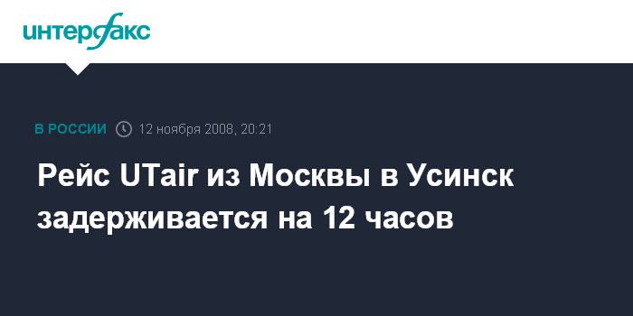 Москва. 12 ноября. INTERFAX.RU - Рейс авиакомпании UTair № 381 "Москва-Усинск" задерживается более чем на 12 часов, сообщил "Интерфаксу" один из пассажиров.