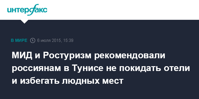 Москва. 6 июля. INTERFAX.RU - МИД РФ напомнил россиянам, находящимся в Тунисе, о необходимости проявлять максимальную бдительность и осмотрительность, сообщается в понедельник на официальном сайте ведомства