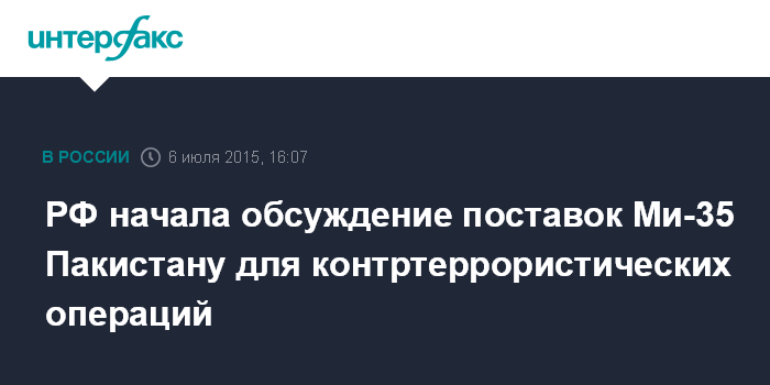 Москва. 6 июля. INTERFAX.RU - Россия и Пакистан ведут переговоры о поставке Исламабаду транспортно-боевых вертолетов Ми-35 для использования в контртеррористических операциях, сообщили в Кремле.