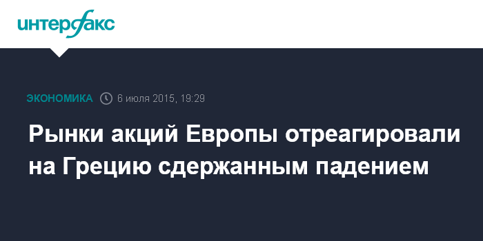 Москва. 6 июля. INTERFAX.RU - Европейские фондовые индексы в понедельник отреагировали на события в Греции сдержанным падением: инвесторы, по-видимому, не ждут скорого расползания финансового кризиса по Европе, сообщает агентство Bloomberg.