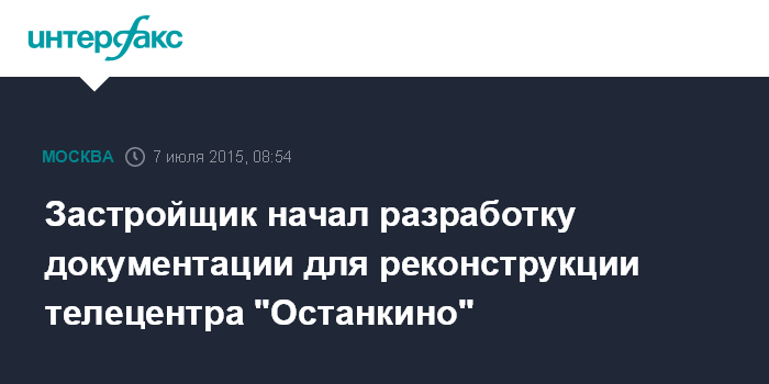 Москва. 7 июля. INTERFAX.RU - Работы по реконструкции телецентра "Останкино" начнутся через два года, сообщил "Интерфаксу" председатель Москомстройинвеста Константин Тимофеев во вторник.