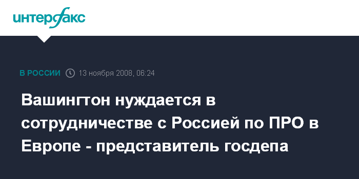 "Мы нуждаемся в сотрудничестве с Россией в этом вопросе и противоракетная оборона - критический компонент того, что мы пытаемся сделать для поддержания региональной стабильности. Мы нуждаемся в сотрудничестве с Россией, мы хотим продолжать дискуссии и продолжать работать, но для танго нужны двое", - отметил представитель госдепа США.