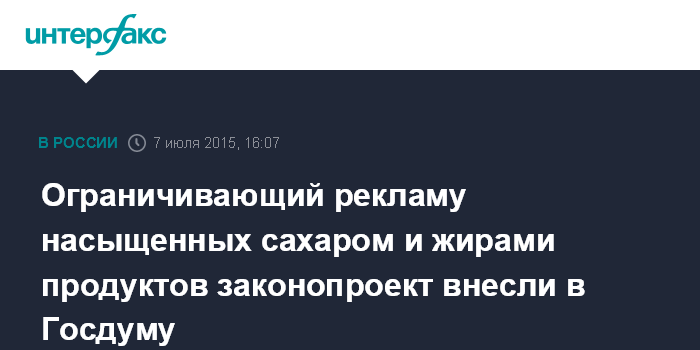 Законопроект устанавливает, что реклама пищевых продуктов с высоким содержанием сахара, соли, жиров не может размещаться в печатных изданиях, радио- и телепередачах, аудио- и видеопродукции, если она предназначена для несовершеннолетних. Вводится запрет с 07:00 утра до 22:00 рекламы подобной продукции в теле- и радиопрограммах.