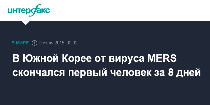 Москва. 8 июля. INTERFAX.RU - Утром в среду в Южной Корее от вируса MERS умер первый за 8 дней человек, сообщило агентство "Ёнхап".