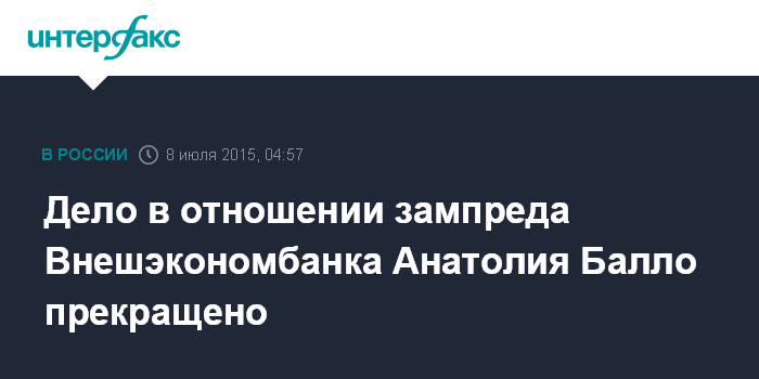 Москва. 8 июля. INTERFAX.RU - Главное следственное управление (ГСУ) ГУ МВД по Москве прекратило следствие по делу заместителя председателя Внешэкономбанка Анатолия Балло, пишет в среду газета "Коммерсант".