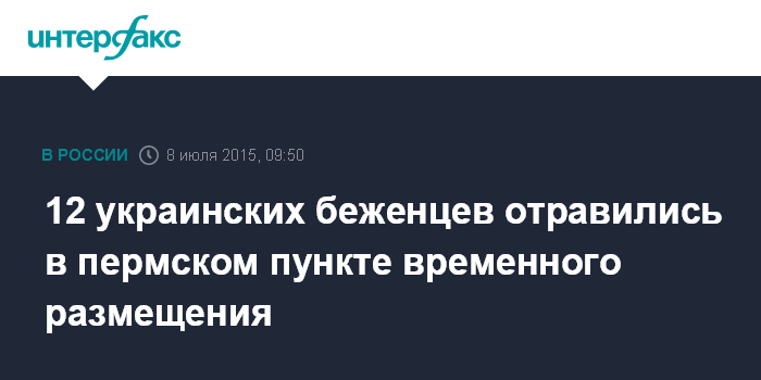 Москва. 8 июля. INTERFAX.RU - 12 украинских беженцев госпитализированы в Пермском крае с пищевым отравлением, сообщает пресс-служба управления Роспотребнадзора по региону.