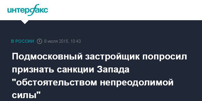 Москва. 8 июля. INTERFAX.RU - Застройщик, связавший возникшие у него проблемы в привлечении финансирования напрямую с западными санкциями против России, добивается признания ситуации форс-мажорной.
