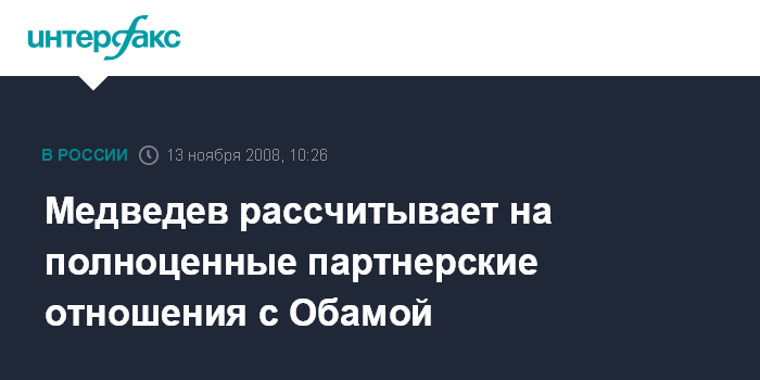 Москва. 13 ноября. INTERFAX.RU - Президент РФ Дмитрий Медведев заявил, что рассчитывает на полноценные партнерские отношения с новым президентом США Бараком Обамой.