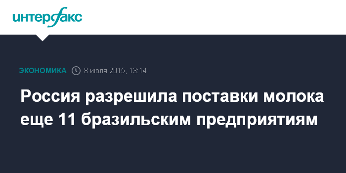 Москва. 8 июля. INTERFAX.RU - Россия разрешила поставки молока 11 бразильским предприятиям под гарантии ветслужбы этой страны. В свою очередь Бразилия приняла условия России по поставкам российского зерна и гарантии Россельхознадзора в отношении российских компаний, заинтересованных в экспорте рыбной продукции в Бразилию.