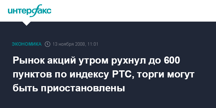Москва. 13 ноября. INTERFAX.RU - Российский рынок акций утром в четверг рухнул до 600 пунктов по индексу РТС за счет очередного обвала всех ликвидных бумаг вслед за мировыми фондовыми площадками и нефтью.