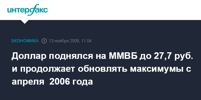 Москва. 13 ноября. INTERFAX.RU - Доллар поднялся на ММВБ к 10:40 мск до 27,7 руб./$1 на сессии расчетами "завтра", прибавив около 17 копеек к уровню закрытия предыдущего дня и обновив максимум с апреля 2006 года. Доллар растет на фоне стремительного снижения евро утром в четверг.
