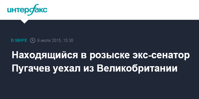 Москва. 9 июля. INTERFAX.RU - Бывший член Совета Федерации Сергей Пугачев, объявленный в международный розыск по обвинению в мошенничестве, покинул Великобританию.
