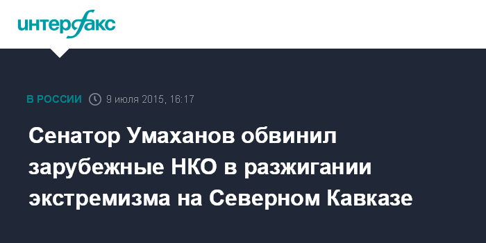 Москва. 9 июля. INTERFAX.RU - Вице-спикер Совета Федерации Ильяс Умаханов, представляющий в верхней палате Дагестан, считает, что ряд зарубежных НКО, действующих на территории Северного Кавказа, пытаются разжигать экстремистские настроения.