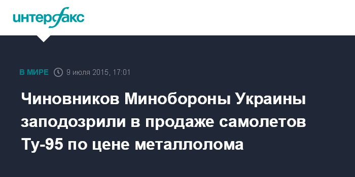 Как сообщает в четверг управление по связям с общественностью и СМИ Генеральной прокуратуры Украины, два самолета-разведчика (на базе бывших стратегических бомбардировщиков Ту-95МС) были проданы по цене металлолома в результате фальсификации отчета об оценке самолетов коммерческой структурой.