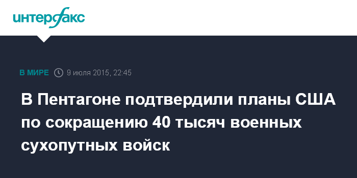 Москва. 9 июля. INTERFAX.RU - Власти США намерены в течение трех лет сократить численность сухопутных войск с 490 тыс. до 450 тыс. военнослужащих, говорится в заявлении Пентагона, распространенном в четверг.