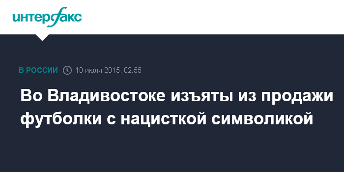 Москва. 10 июля. INTERFAX.RU - Полиция изъяла футболки с нацистской символикой, свободно продававшиеся в одном из торговых центров Владивостока.