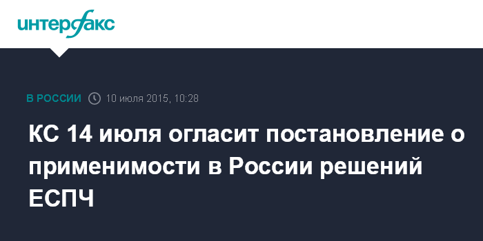 Москва. 10 июля. INTERFAX.RU - Конституционный суд на заседании во вторник, 14 июля, огласит постановление по делу о применимости решений Европейского суда по правам человека в России. Согласно информации на официальном сайте суда, заседание пройдет в 10.00.