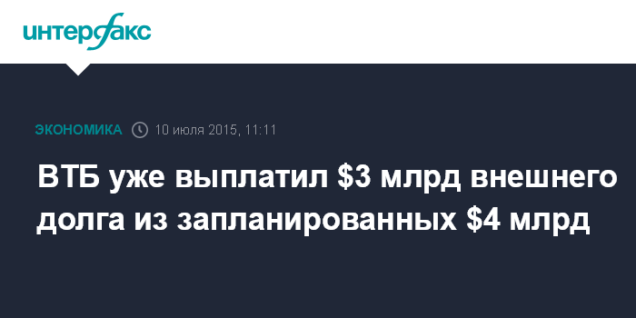 Москва. 10 июля. INTERFAX.RU – ВТБ, второй по величине российский банк, уже выплатил $3 млрд внешнего долга из $4 млрд, которые банк должен был погасить в 2015 году, сообщил глава ВТБ Андрей Костин на встрече с премьер-министром Дмитрием Медведевым.